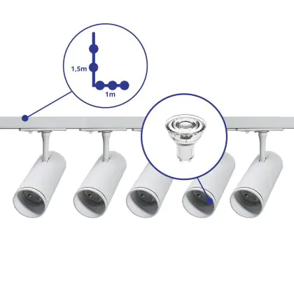 Beschreibung Bright Choice Komplettset 1-Phasen Rail L 1 x 1,5 Meter Weiß | incl. 5x Spot + GU10 2700K 3W Dimmbar + Abschlusskappe, Stromanschluss und L -Verbinder