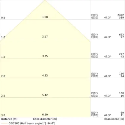 Der Abstrahlwinkel bezeichnet den Winkel, in dem das Licht aus der Lichtquelle ausgestrahlt wird. Er wird in Grad (D) angegeben. Je geringer die Gradzahl des Abstrahlwinkels ist, desto kleiner ist auch der Durchmesser des Lichtkegels, den die Lichtquelle produziert. Beispiel: Wird eine Lampe mit einem Abstrahlwinkel von 60 Grad an der Decke (2,5 m Höhe) angebracht, erzeugt sie einen Lichtkegel von 2,9 Metern Durchmesser. Hat die Lampe hingegen einen Abstrahlwinkel von 120 Grad, beträgt der Lichtkegel 8,7 Meter im Durchmesser. |