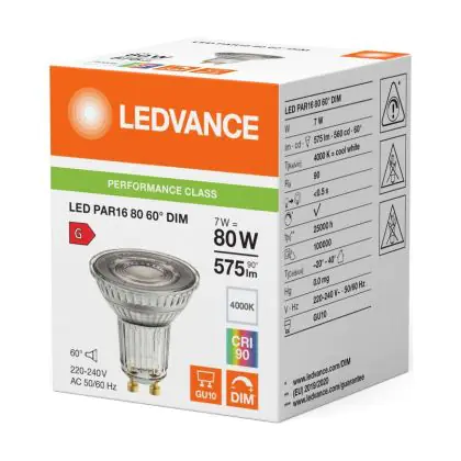 Die Ledvance LED PAR16 GU10 Reflektor 7W 575lm 60D - 940 Kaltweiß | Höchste Farbwiedergabe - Dimmbar - Ersatz Für 80W ist eine effiziente GU10 LED-Lampe und der perfekte Ersatz für Ihre konventionelle Halogenlampe mit 80W und einem GU10-Sockel, bei welchem die zwei Stifte einen Abstand von 10 mm zueinander haben. Zudem strahlt das Produkt Licht in der Farbtemperatur 4000K - Kaltweiß aus und punktet durch eine lange Lebensdauer.