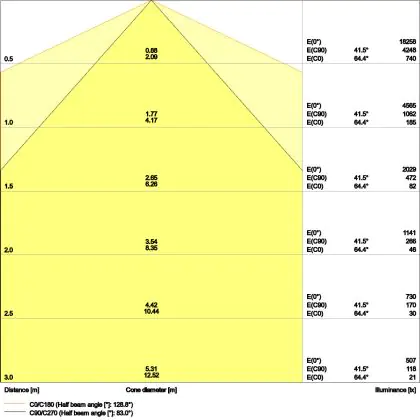 Der Abstrahlwinkel bezeichnet den Winkel, in dem das Licht aus der Lichtquelle ausgestrahlt wird. Er wird in Grad (D) angegeben. Je geringer die Gradzahl des Abstrahlwinkels ist, desto kleiner ist auch der Durchmesser des Lichtkegels, den die Lichtquelle produziert. Beispiel: Wird eine Lampe mit einem Abstrahlwinkel von 60 Grad an der Decke (2,5 m Höhe) angebracht, erzeugt sie einen Lichtkegel von 2,9 Metern Durchmesser. Hat die Lampe hingegen einen Abstrahlwinkel von 120 Grad, beträgt der Lichtkegel 8,7 Meter im Durchmesser. |