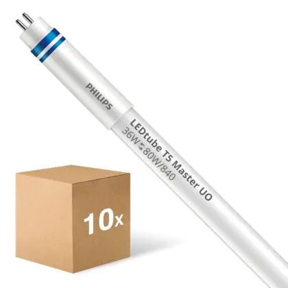 Die Mehrfachpackung 10x Philips LED Röhre T5 MASTER (HF) Ultra Output 36W 5600lm - 840 Kaltweiß | 145cm - Dimmbar - Ersatz Für 80W ist eine effiziente LED-Röhre und der perfekte Ersatz für Ihre konventionelle Leuchtstoffröhre mit 80W und einem G5. Die Röhre hat eine Länge von 1450 mm und einen Durchmesser von 21 mm. Zudem strahlt das Produkt Licht in der Farbtemperatur 4000K - Kaltweiß aus und punktet durch eine lange Lebensdauer.