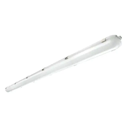 Die LED-Feuchtraumleuchte hat eine Länge von 150 cm und verfügt über einen integrierten Philips-LED-Treiber. Das Noxion-Produkt ersetzt zwei konventionelle Leuchten à 58 Watt. Selbst verbraucht es nur 55 Watt – eine schnelle Amortisation der Anschaffungskosten ist damit gewährleistet. Diese LED hat mit einem Wert von 4.000 K eine kaltweiße Farbtemperatur. Sie ist IP65- und IK08-klassifiziert. Bitte beachten Sie: Dieses Produkt kann nicht als Notfallbeleuchtung eingesetzt werden.