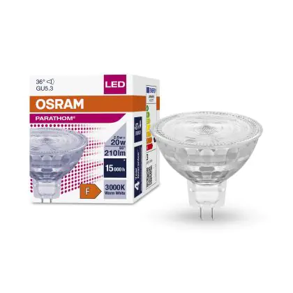 Die Osram Parathom LED-Spot GU5.3 MR16 3W 230lm 36D - 830 Warmweiß | Ersatz für 20W ist eine effiziente GU5.3 LED-Lampe und der perfekte Ersatz für Ihre konventionelle Halogenlampe mit 20W und einem GU5.3-Sockel, bei dem die beiden Stifte einen Abstand von 5,3 mm zueinander haben. Die Abkürzung MR16 zeigt Ihnen, dass der Reflektor einen Durchmesser von 5 cm hat. Zudem strahlt das Produkt Licht in der Farbtemperatur 3000K - Warmweiß aus und punktet durch eine lange Lebensdauer.