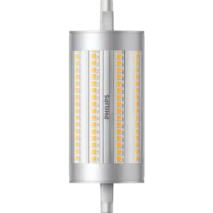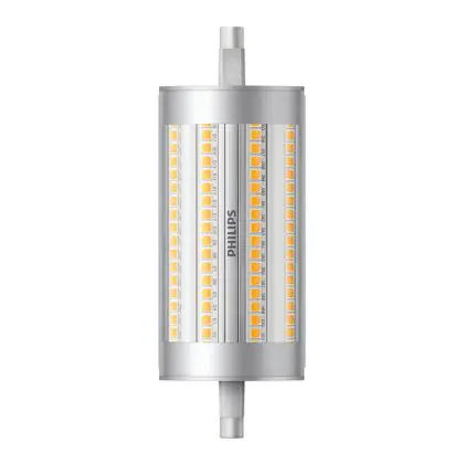 Die Philips CorePro LEDlinear R7s 17.5W 830 118mm | Dimmbar - Ersatz für 150W sind zweiseitig gesockelte Stablampen mit R7s-Sockel. Die LEDs sind der ideale LED-Ersatz für herkömmliche Halogenlampen und bieten dank ihrer besonderen Bauform rundum hochwertiges LED-Licht. Die CorePro-Lampe ist zudem dimmbar und arbeitet dank moderner LED-Chips besonders effizient.