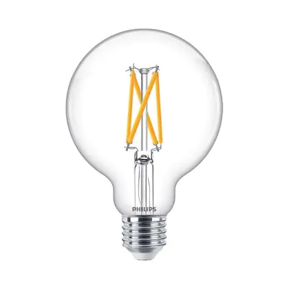 Die Philips MASTER Value LED Globe E27 93mm Fadenlampe Klar 5.9W 806lm - 922-927 Extra Warmweiß | Höchste Farbwiedergabe - Dimmbar - Ersatz Für 60W ist eine effiziente E27 LED-Lampe mit Retrodesign und der perfekte Ersatz für Ihre konventionellen 60W Lampen mit E27. Zudem strahlt sie Licht in der Farbtemperatur 2200K - 2700K Dim To Warm aus und punktet durch eine lange Lebensdauer.