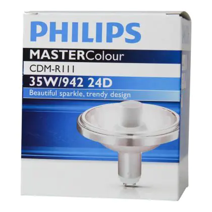 Die Philips CDM-R111 35W 942 GX8.5 24D (MASTERColour) Entladungslampen haben einen sehr guten Farbwiedergabeindex von 90-100Ra. Diese Lampe spendet ein helles weißes Licht (4200K). Der UV-Filter sorgt dafür, dass wärmeempfindliche Objekte keinen Schaden tragen und sich nicht verfärben.