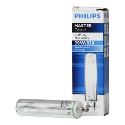 CDM-Tm Mini sind kompakte Entladungslampen mit Keramik-Brenner. Dies sind Miniatur-Lampen und dadurch sehr kompakt. Sie kombinieren einen niedrigen Stromverbrauch mit einer hohen Lichtleistung. Der einfache GU6.5 Lampensockel der Philips CDM-Tm Mini 20W 830 GU6.5 (MASTERColour) Entladungslampe macht ein einfaches Austauschen möglich. Es ist kein Installateur notwendig, Sie können es ganz einfach selbst tun.
