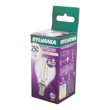Die Sylvania ToLEDo Retro Ball E14 ist eine energieeffiziente LED-Lampe. Sie hat einen Eigenbedarf von nur 4 Watt, ersetzt dabei jedoch traditionelle Leuchtmittel von 40 Watt. Das ermöglicht eine Energieersparnis von 90 %. Darüber hinaus hat die LED einen E14-Sockel und ein kugelförmiges Design. Sie spendet extra warmweißes Licht mit einer Farbtemperatur von 2.700 Kelvin.